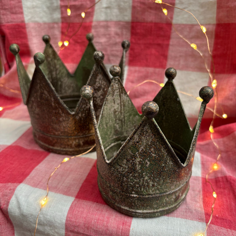 Crown shaped, vintage inspired, metal planters/candle holder. Available in two sizes, use to display festive plants, flower arrangements or hold a candle.