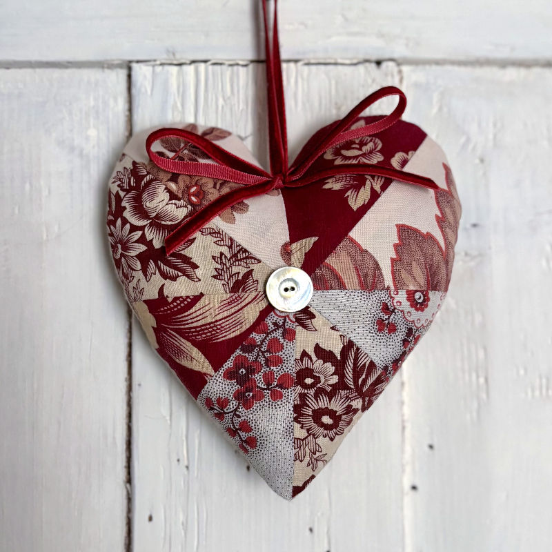 One-of-a kind handmade hearts, as unique as the stories woven into them, carefully pieced togther from the most treasured scraps of vintage fabric, far too lovely to throw away. All filled with lavender and hung from a velvet bow, with a vintage mother-of-pearl button centre. Size approx. 15 x 17cm