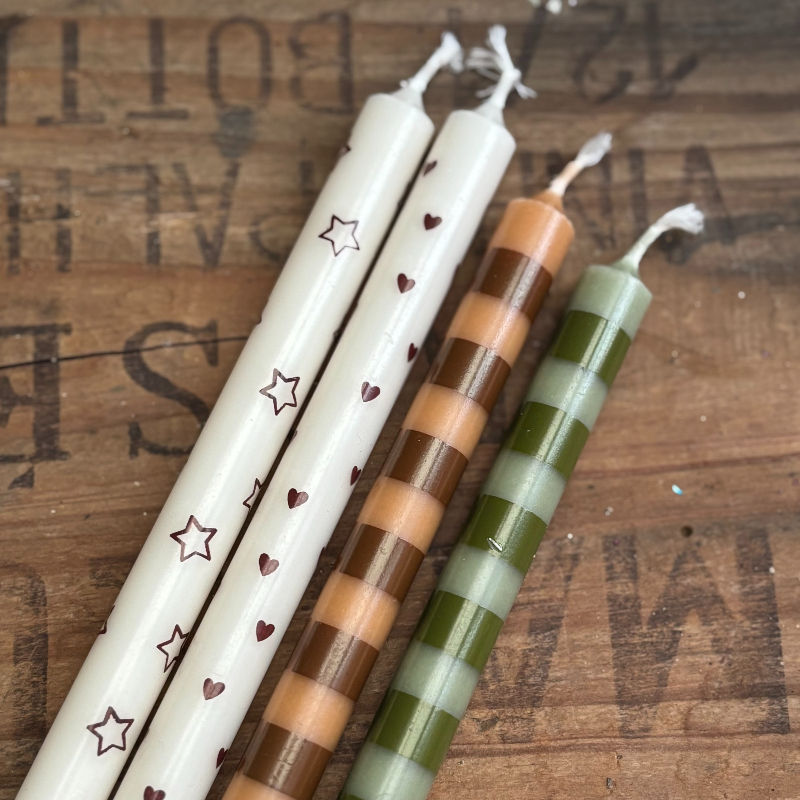 Tall, patterned, taper candles, approx. 20cm x 1.3cm. 3 hrs burn time. (0% stearin, 10% paraffin.